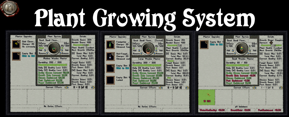 The PU Plant System is a comprehensive gardening framework where players grow decorative plants in craftable planters. The system features daily quality checks, growth stages, plant health mechanics, status effects, upgrades, and material-based bonuses.